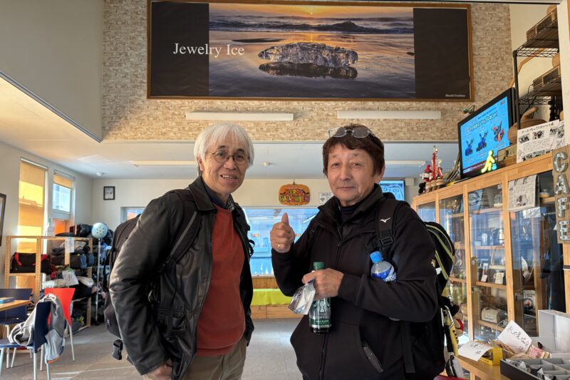帯広のカーリング場「カールプレックス」で、北海道シニアカーリング予選会が開かれています。仲間に頼まれて写真を撮りに行ってきました。そこで、世界選手権に何度も一緒に出場した橋本くん(こんなこと書くと、互いすごいカーラーみたいですね!)に久しぶりに再会。私ジュエリーアイスの大きな写真が飾られているロビーで、一枚パチリ。