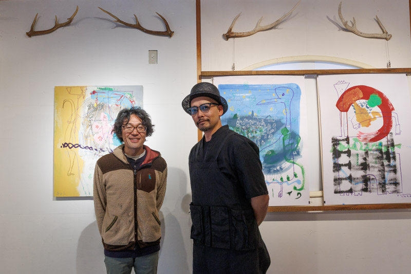 斎藤ヒロトさん(写真左)の絵の展示を見に、ギャラリーカフェ「Carita」へ。右にいるのはオーナーの刈田さん。午後3時から刈田さんのダンスパフォーマンスが。見たかった!