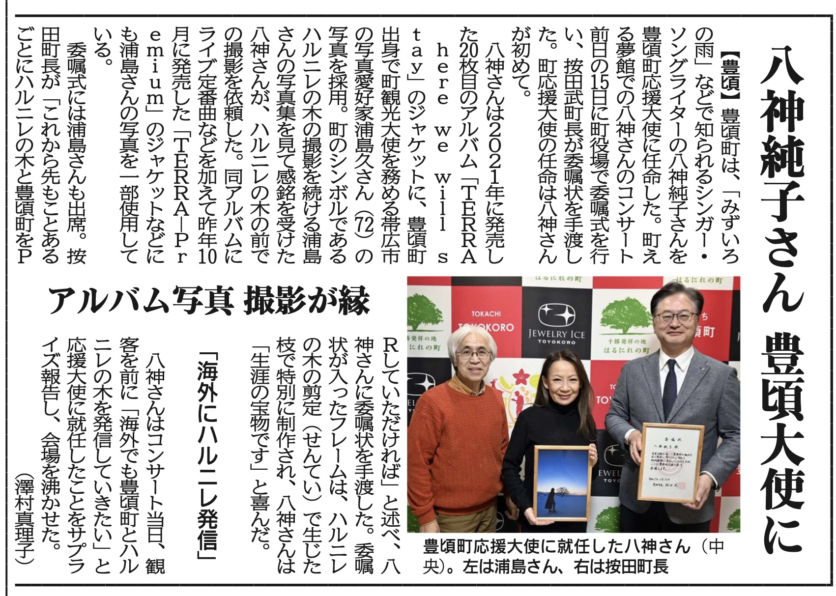 八神純子さんが豊頃町の応援大使になったというニュースが、十勝毎日新聞に載りました。これから全国のコンサートで、またハルニレの話をしてくれると思うと、なんだか嬉しくなります。