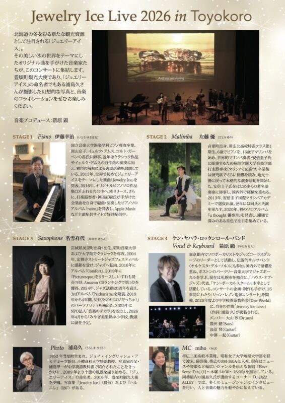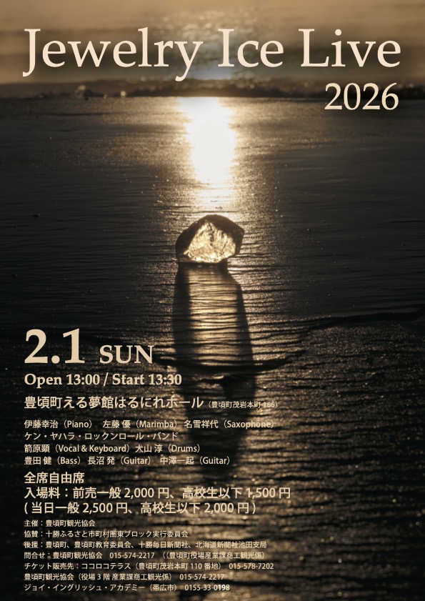 早いもんです。今年もジュエリーアイス・ライブをご案内する時期になりました。今回で6回目、豊頃町では5回目の開催になります。考えてみると、こんな手の込んだコンサートを6回も続けてこられたのは、奇跡に近いことです。なにせ参加するミュージシャンは、毎回ジュエリーアイスの“オリジナル曲”を準備してこないといけないのです。これは本当に大変なことです。