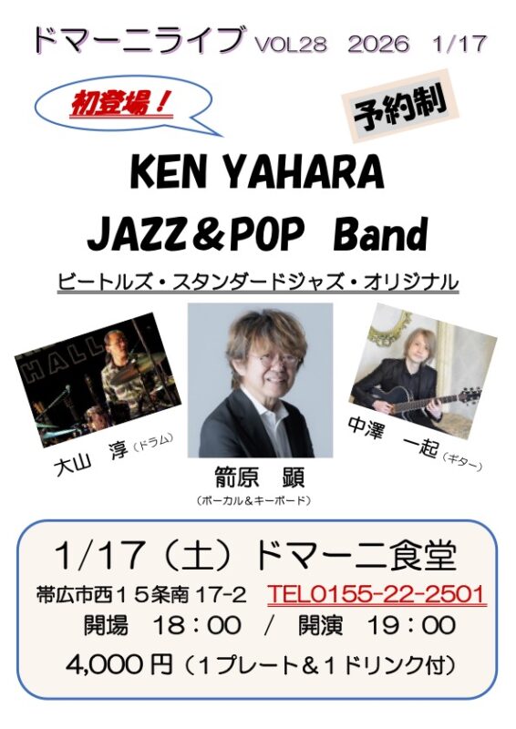 いつもリーズナブルな金額で食事とライブが楽しめるのが、ドマーニ食堂です。1月のライブは箭原顕さんのバンドが登場します。