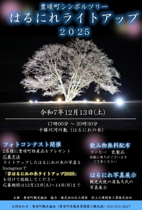 今年もハルニレがライトアップされます。日時は 13日(土)17:00〜20:30。一年に一度だけのライトアップです。この機会にぜひどうぞ。晴れていれば星も見えますし、雪が降ればさらにロマンチックな雰囲気に。