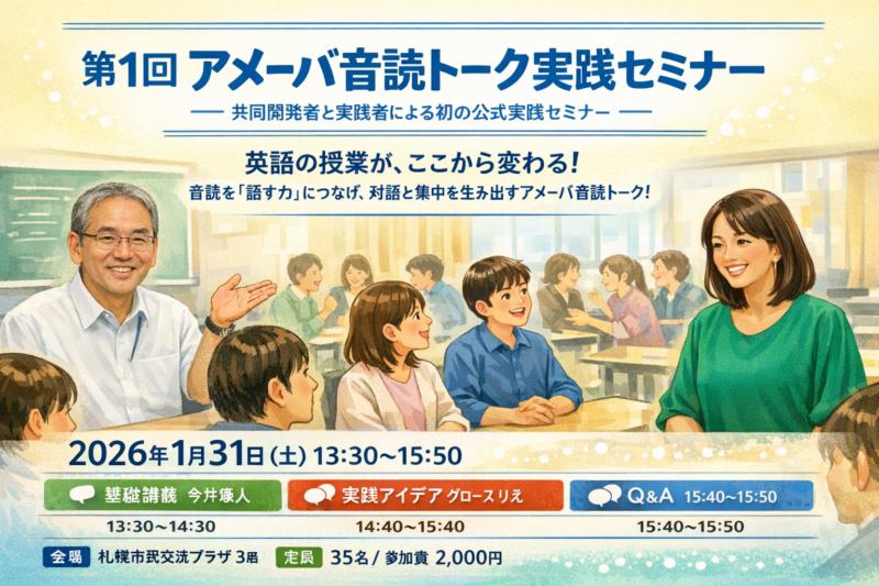 英語の授業が、ここから変わる。音読を「話す力」につなげ、教室に対話と集中を生み出すアメーバ音読トーク。本セミナーでは、開発者と実践者から直接、明日から使える授業の具体像を学びます。