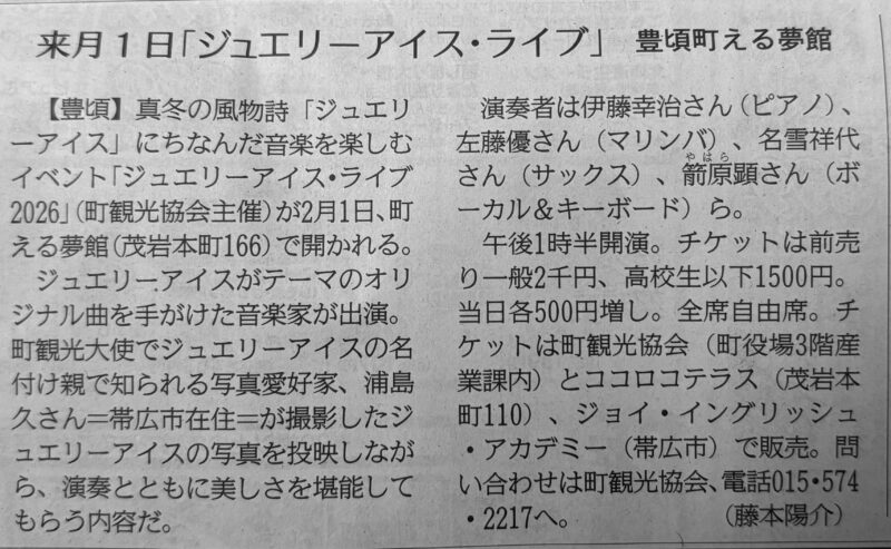 いよいよ今年のジュエリーアイス・ライブが近づいてきました。2月1日(日)です。今日の北海道新聞朝刊に案内が出ています。今年もいろいろなサプライズがあり、楽しいライブになりそうです。チケットをまだ買っていない方は、早めにお願いします。