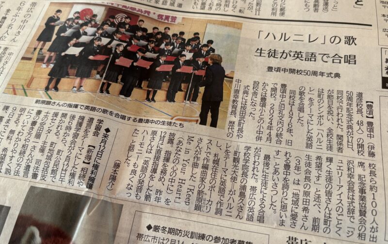 21日付の北海道新聞に、豊頃中学校開校50周年式典の記事が掲載されました。その中でもひときわ注目を集めたのは、生徒たちによる合唱でした。