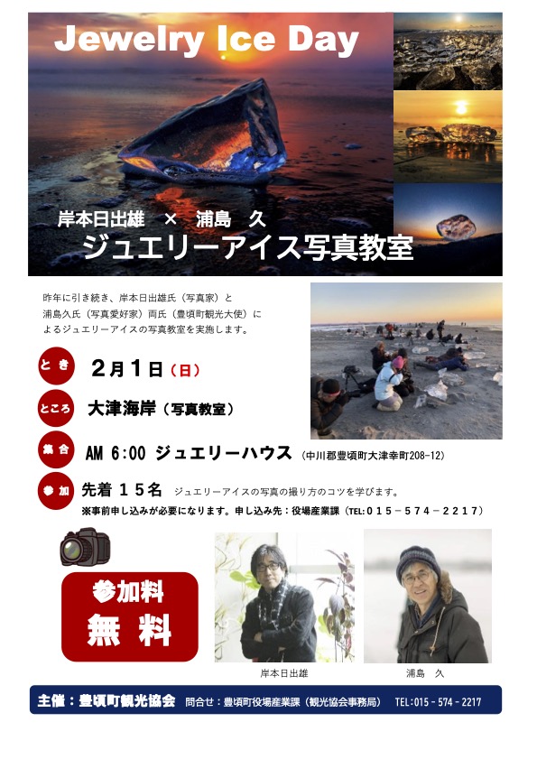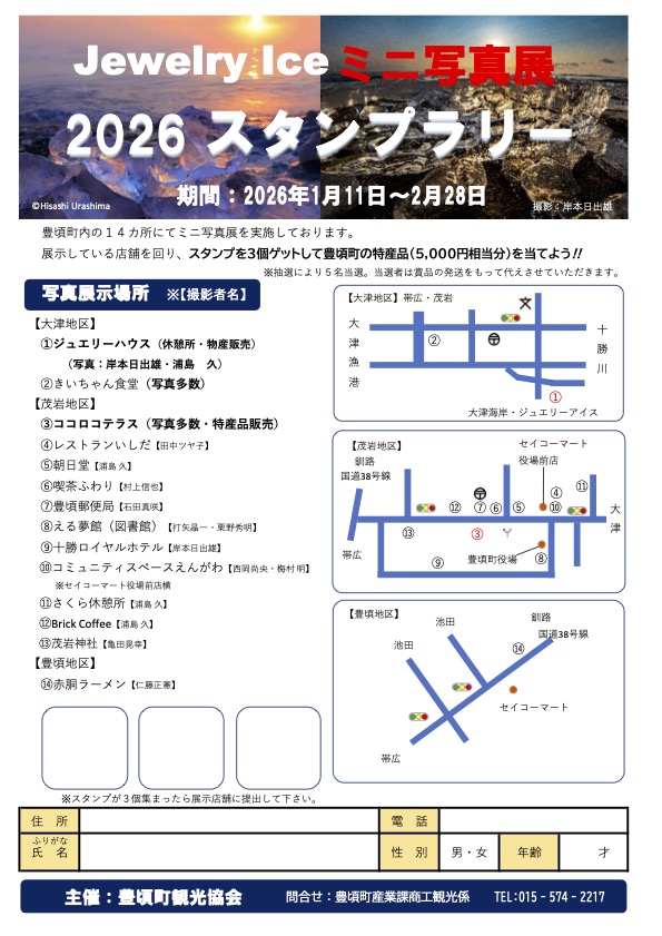 天気予報では、当日は雪は降らないようです。ぜひ、豊頃まで快適なドライブを楽しんでください。早朝から来られる方には、写真教室もおすすめです。また、町のあちこちでミニ写真ギャラリーが開かれています。スタンプラリーも実施中です。