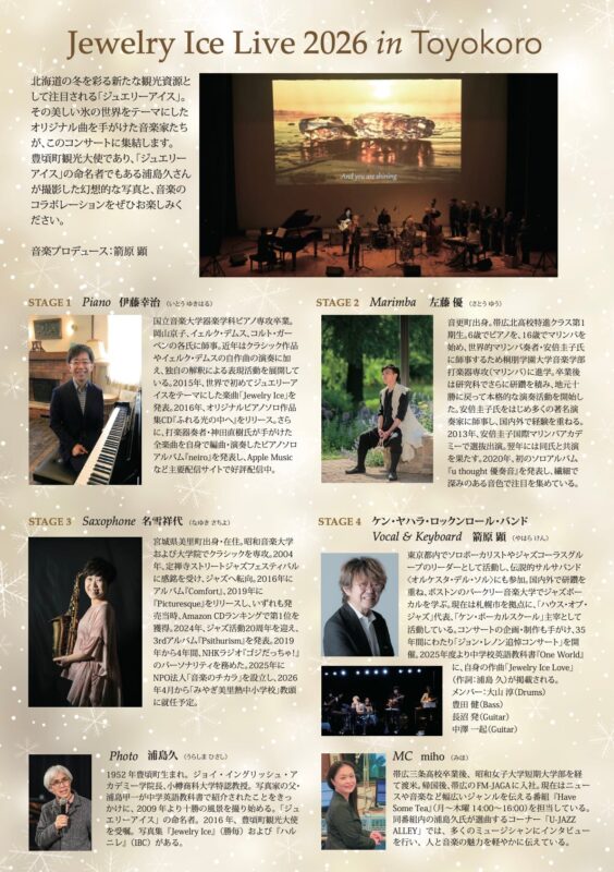 今年のジュエリーアイス・ライブは、2月1日(日)13:30スタートです。4組の魅力的な音楽家が参加し、それぞれ私のジュエリーアイスの写真とコラボします。今回は、ピアノ、マリンバ、ジャズ、ビートルズと、多彩な音楽を一度に楽しめるコンサートになります。まだチケットをお求めでない方は、私(浦島)までご連絡ください。