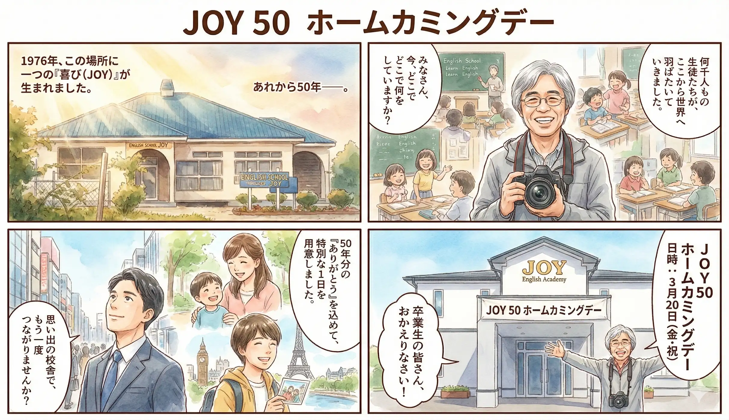 ジョイは、今年の3月20日で50周年を迎えます。そんな節目の日に、特別イベントを開催することになりました。呼び名は「JOY50ホームカミング」です。