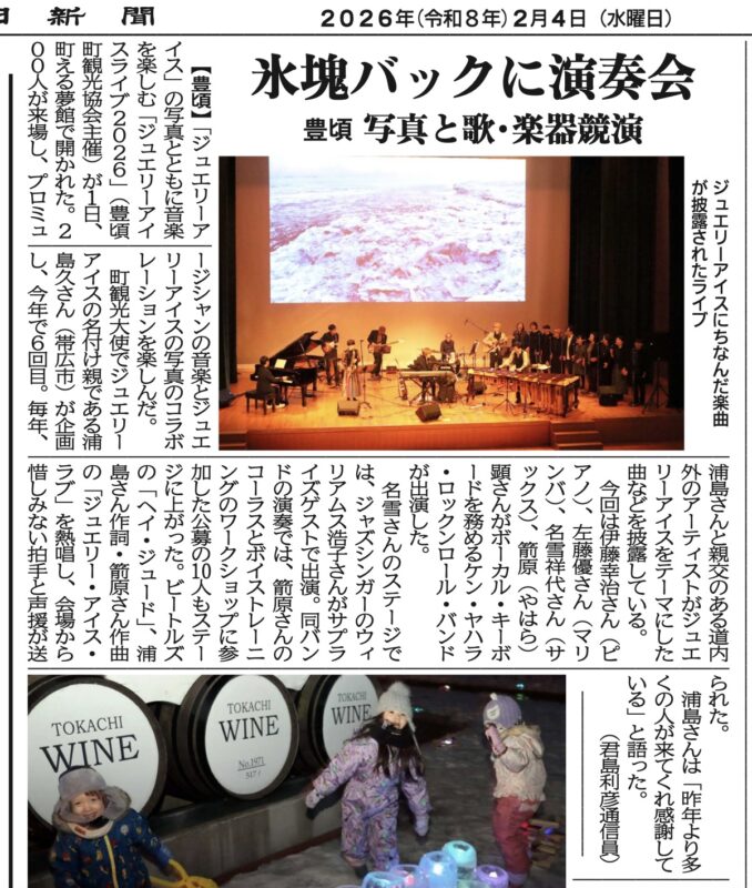 4日付の十勝毎日新聞に、ジュエリーアイス・ライブの記事が掲載されました。今回は、新たにジュエリーアイスをテーマにした新曲が2曲誕生しました。
