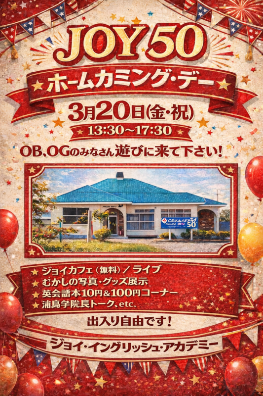 ジョイは今年、50周年を迎えます。開校記念日の3月20日(金・祝)に、「JOY50ホームカミング・デー」を開催します。