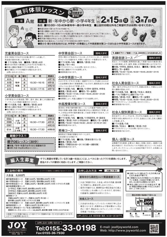 2回目の体験レッスンは3月7日(土)です。興味のある方はぜひご参加ください。音読コースや社会人コースは随時見学できますので、お気軽にご連絡ください。お待ちしています。