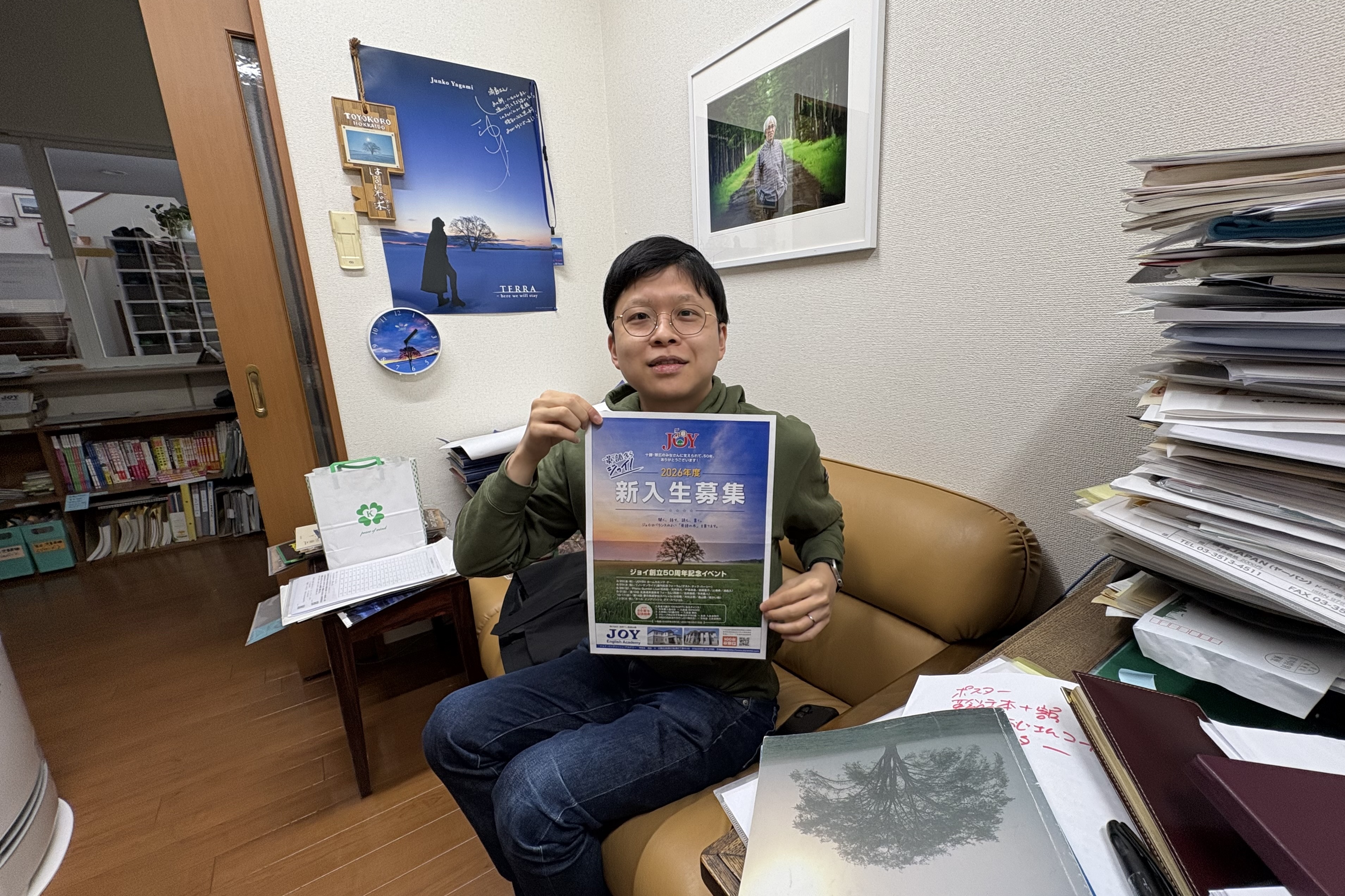田本くんが久しぶりに顔を出してくれました。幼稚園の頃から高校卒業まで、ずっとジョイに通ってくれていた生徒です。