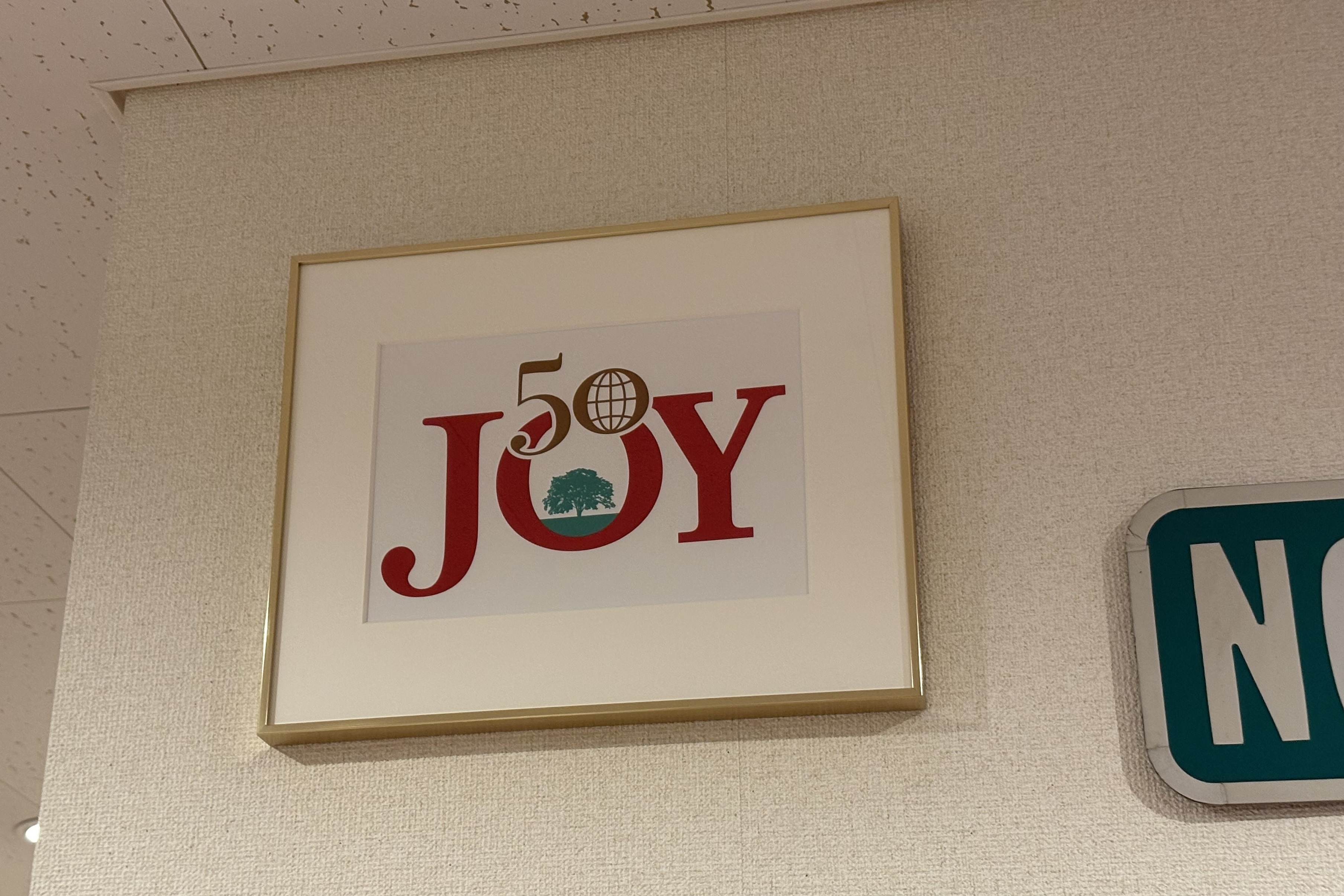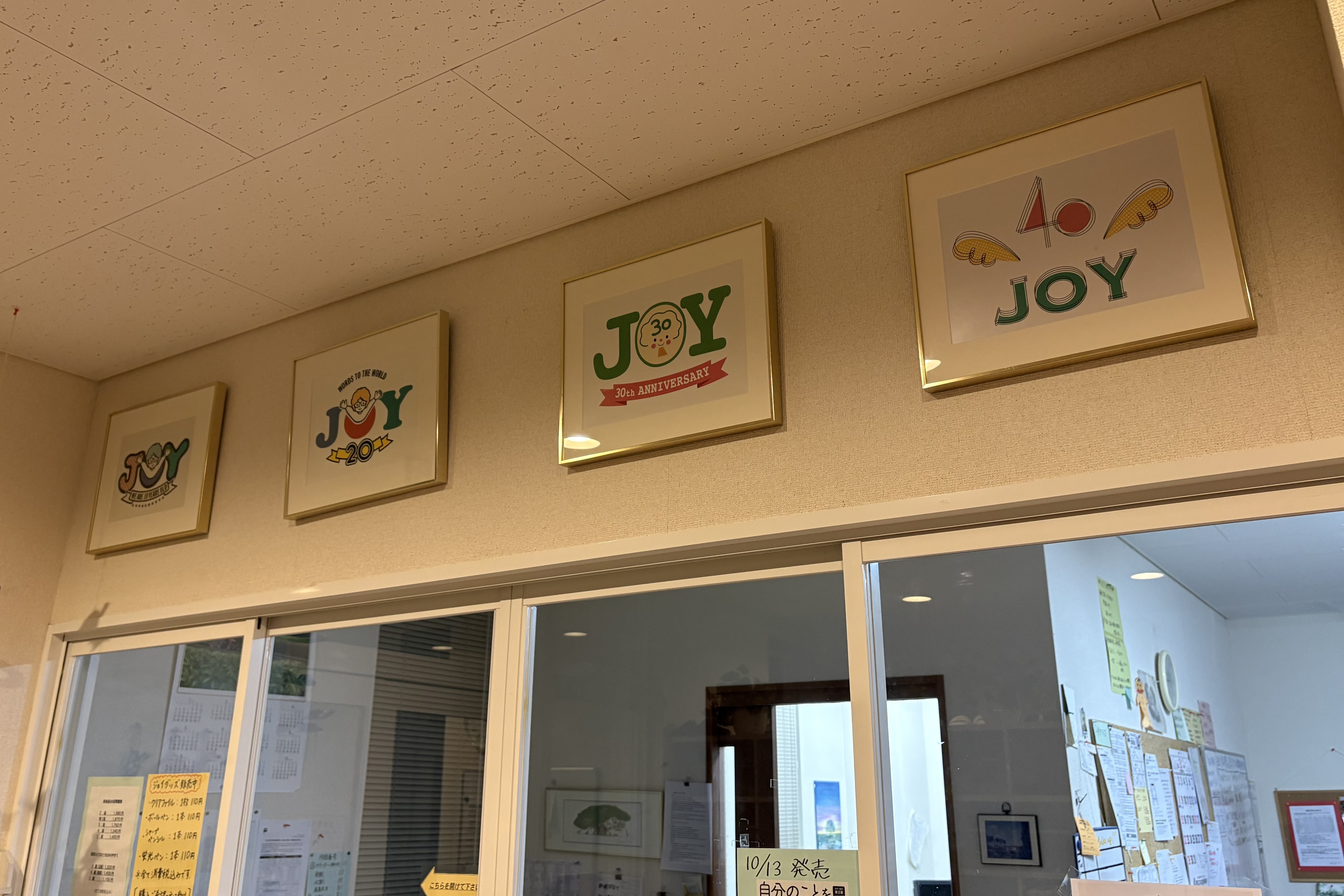 ジョイ50周年のシンボルマークが額に入り、A館の壁に飾られました。制作は札幌在住の映像作家、佐竹真紀さん。私の姪です。これまで30周年、40周年のシンボルマークも担当してもらいました。