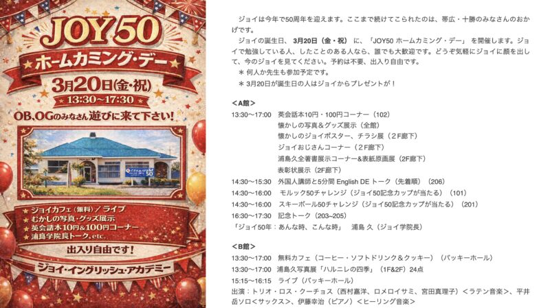 こうした懐かしいジョイに触れられるのが、20日(金・祝)の「JOY50ホームカミング・デー」。元生徒の方も、今通っている方も、そしてジョイに興味のある方も、ぜひ遊びに来てください。