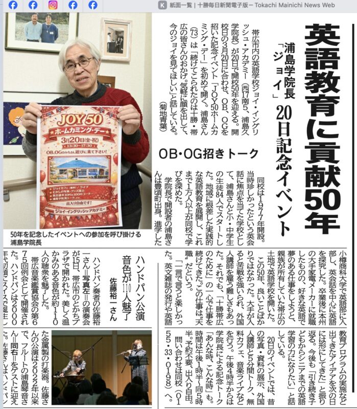 18日付の十勝毎日新聞に、「JOY50ホームカミング・デー」(20日)の記事が掲載されました。この記事を見た卒業生や元生徒のみなさん、ぜひ久しぶりにジョイの校舎へお越しください。もちろん一般の方でも歓迎します。