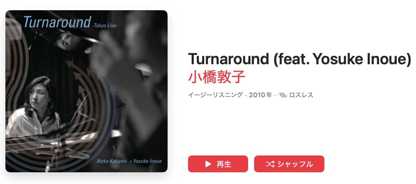 最後のアルバムを何にするか迷いましたが、オランダ・アムステルダム在住のピアニスト、小橋敦子さんのアルバム『Turnaround』を選ばせてもらいました。最近の作品はすでに紹介していたので、今回は2010年に日本で録音されたこのアルバムにしました。実はこれ、かなり気に入っています。