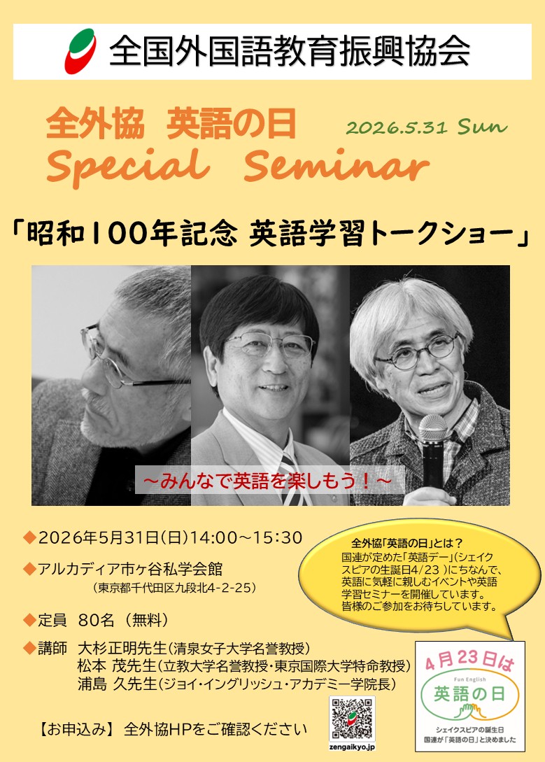 それにしても、「昭和100年記念 英語学習トークショー」というタイトル、なんともレトロです。いや、もしかするとタイトル以上にレトロなのは、講師の3人かもしれません。