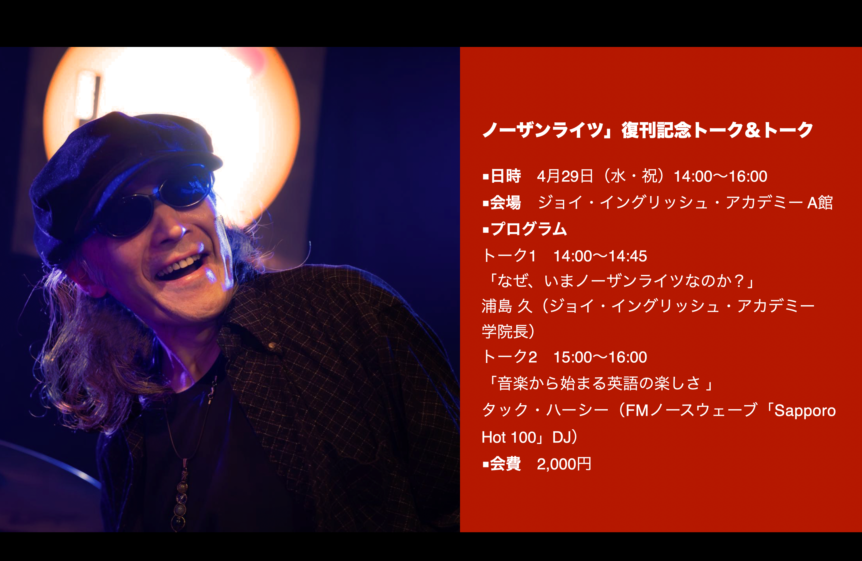 「ノーザンライツ」復刊記念トーク&トークは、29日(水・祝)です。特別ゲストはタック・ハーシーさん。ご存知、FMノースウェーブ「Sapporo Hot 100」のDJです。新しく始まる「ノーザンライツ」に連載していただくことになり、今回のイベントにも登場してもうらうことになりました。