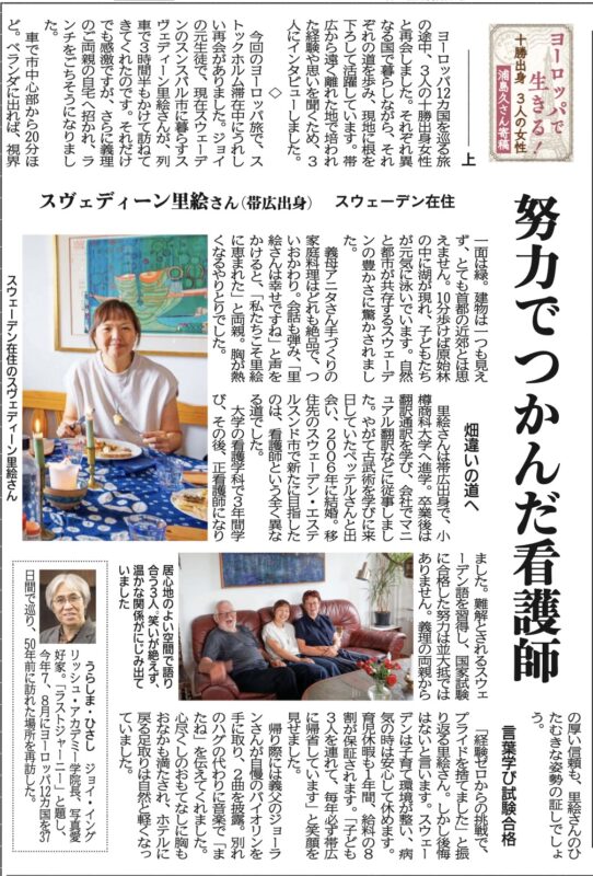 十勝毎日新聞に3回にわたり「Last Journey」で会った十勝出身の3人の女性について書かせてもらいました。一人目はスウェーデン在住のスヴェディーン里絵さんです。次回帯広に来るときには、またジョイでトークをやってもらいたいと考えています。