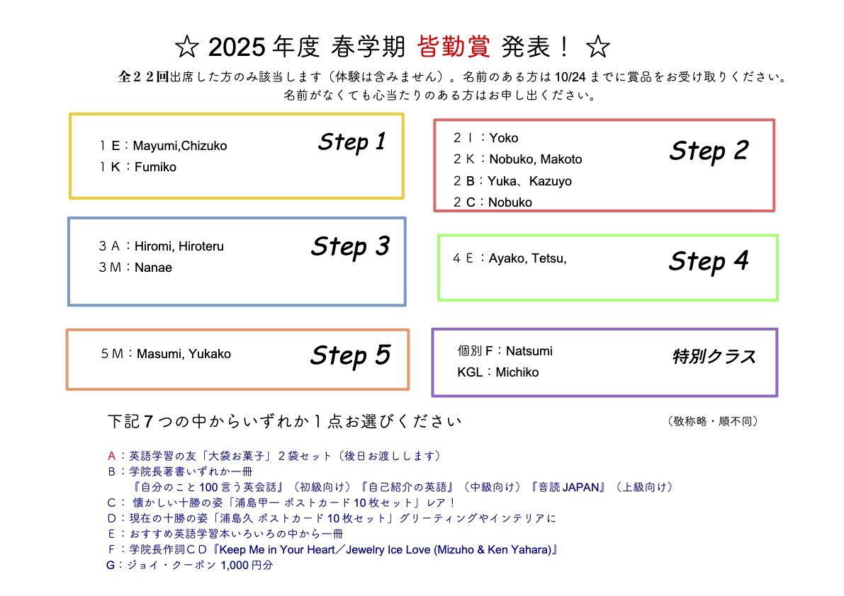 2025年4月〜10月の半年間、振替も含めて全22回出席した方に皆勤賞をご用意しました。