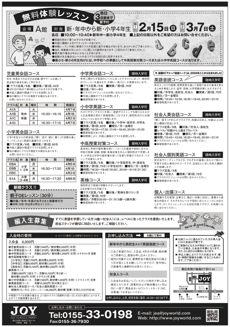 2026年度新入生募集中 2026.02.03 おとな通信 こども通信 2026年度新入生を募集しております。 4歳から社会人まで、各クラスで無料体験、ご相談受付中です。 お電話(0155-33-0198)か、お問い合わせよりご連絡ください。 2026.02.03 15:33