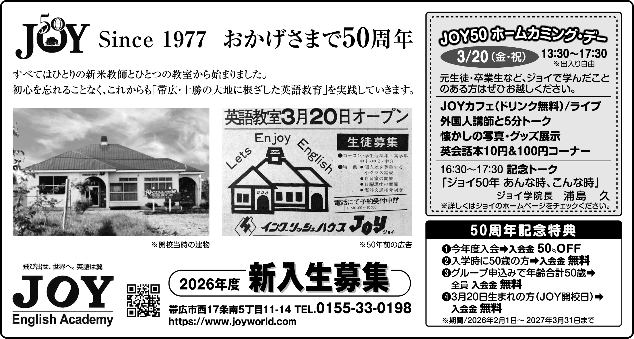 ジョイの誕生日、 3月20日(金・祝) に、「JOY50 ホームカミング・デー」 を開催します。ジョイで勉強したことのある人なら、誰でも大歓迎です。どうぞ気軽にジョイに顔を出して、今のジョイを見てください。予約は不要、出入り自由です。