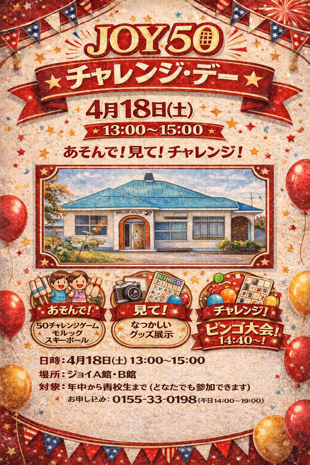 ジョイは今年、50周年! これを記念して、だれでも楽しめるスペシャルイベントを開催します! 英語が話せても話せなくてもぜんぜん大丈夫! ゲームやあそびを楽しみながら、ワクワクの時間をすごそう! お友達といっしょに、ぜひ遊びに来てください!